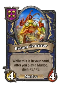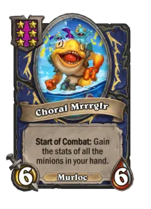 The bread and butter of your army IF you are focused on the “hand murloc” build, not the Keyword one. This Murloc is the key minion that everything else revolves around. Basically, if you have two of these in your hand, Brann Bronzebeard, Primalfin Lookout, and Young Murk-Eye, you can start printing Murlocs and just playing them and gaining massive stats on your Bream Counters in your hand. Finally, finding Choral Mrrrgl is the key as he copies all the stats in your hand (your two buffed Bream Counters) and Bassgills to summon the buffed Bream Counters.